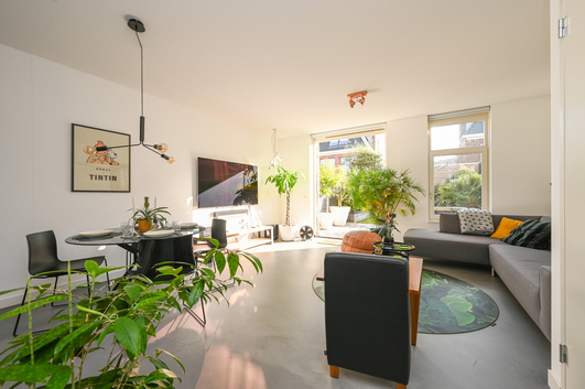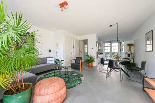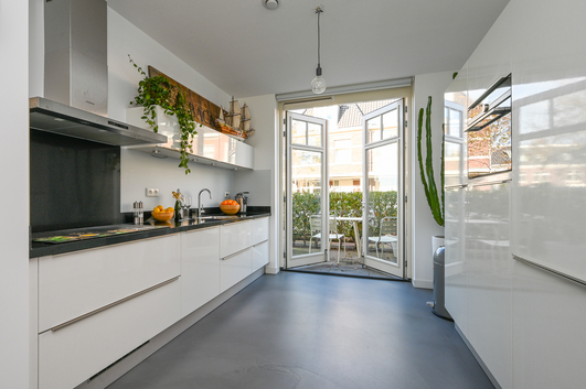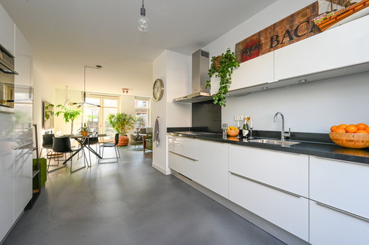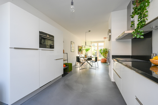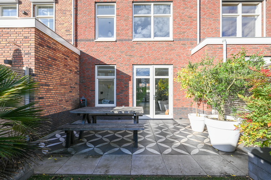 De royale, lichte woonkamer is afgewerkt met een strakke gietvloer en een verzorgd gestuct plafond. De grote raampartijen en openslaande deuren zorgen voor een prachtige verbinding met de achtertuin en creëren een heerlijke leefruimte met veel daglicht. Extra bijzonder: als enige woning in de rij zijn de openslaande deuren aan de voorzijde verbonden met de voortuin. De keurig verzorgde achtertuin is gesitueerd op het zuidoosten waardoor u de hele dag van de zon kunt genieten. Het is een ideale plek voor ontspanning, spelende kinderen of gezellige diners.