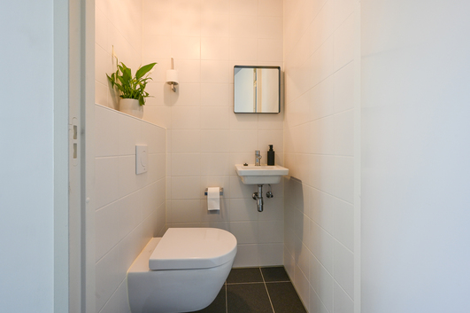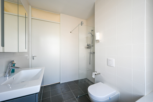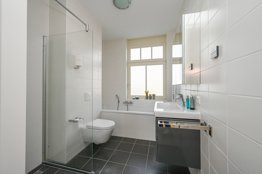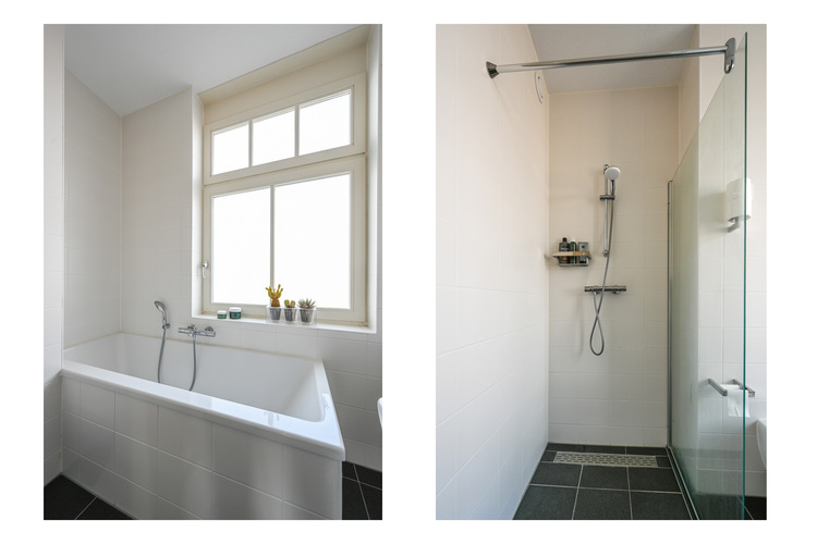 De moderne badkamer is volledig betegeld en voorzien van alle comfort. Hier beschikt u over een ruime inloopdouche, een stijlvol wasmeubel, een handdoekenradiator en een tweede toilet met hangcloset en inbouwreservoir.