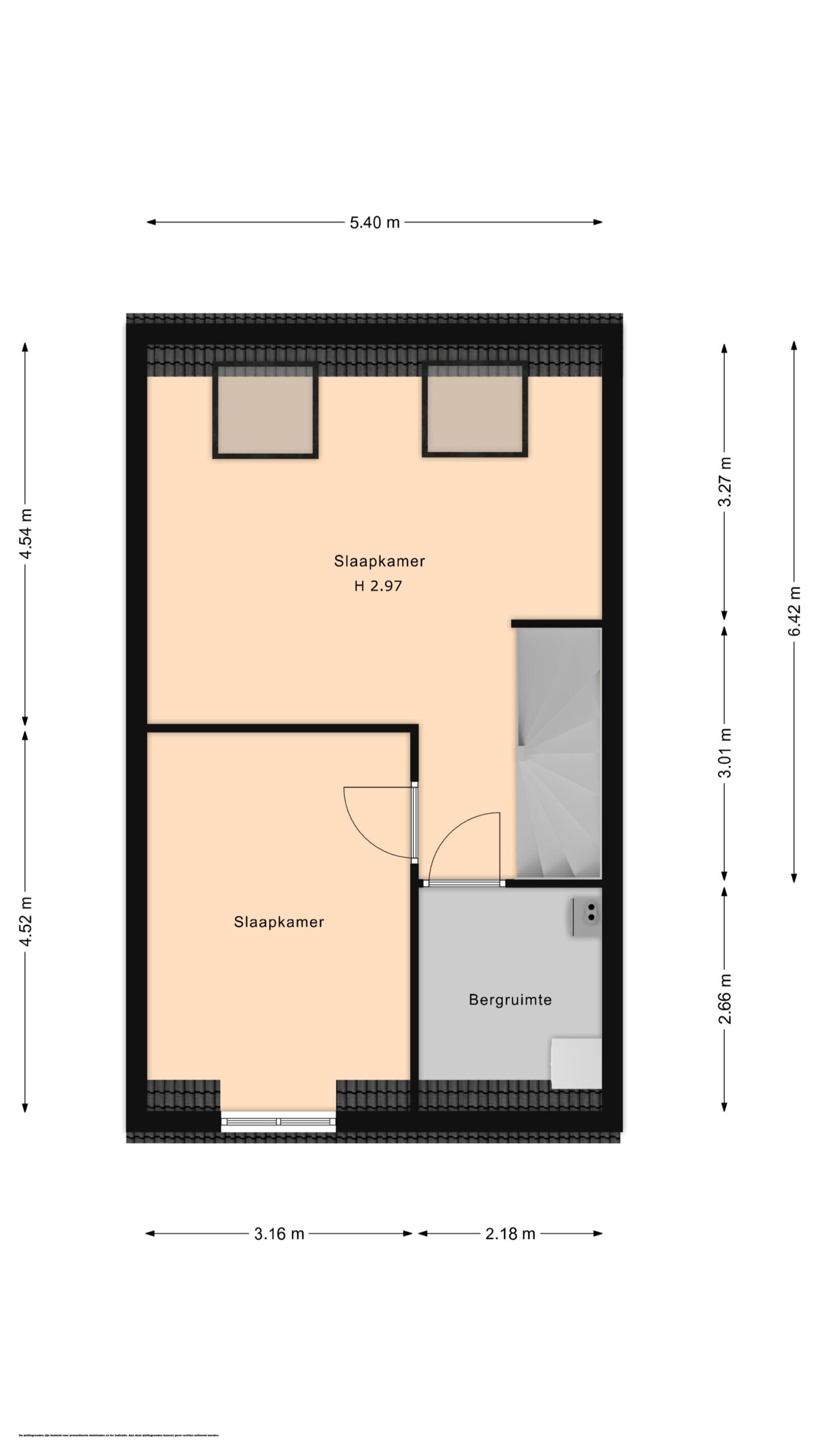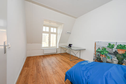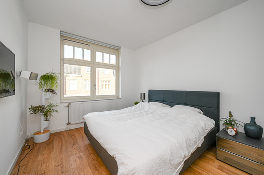 De tweede verdieping verrast met een royale plafondhoogte van circa 2,90 meter, waardoor de ruimte bijzonder ruimtelijk en licht aanvoelt. Hier bevindt zich een riante slaapkamer met twee grote dakramen die zorgen voor een fraaie lichtinval en een prettig uitzicht op de lucht.