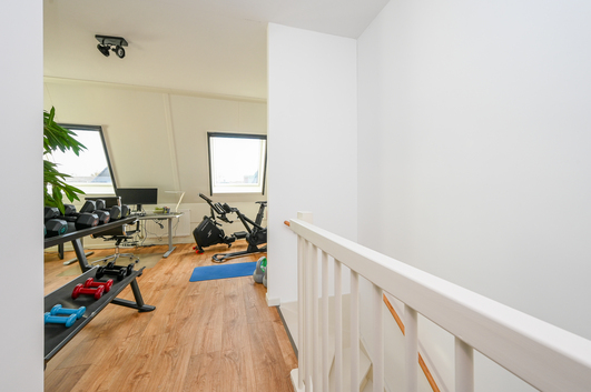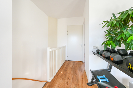 De overloop biedt toegang tot twee slaapkamers aan de achterzijde, waaronder een ruime en lichte masterbedroom. Beide kamers kijken uit over de verzorgde achtertuin, wat zorgt voor een rustig en groen uitzicht.