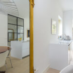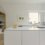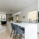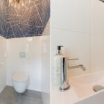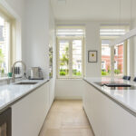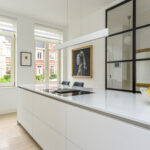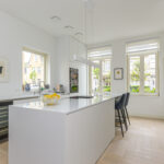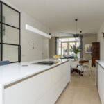 Prettige voor- en zijtuin met toegang tot de woning, oprit voor 2 auto’s en toegang tot de achtertuin. Bij binnenkomst valt direct het hoge afwerkingsniveau op voor stucwerk, plafondhoogte en trendy pui naar de woonkamer. In de hal een meterkast (16 groepen), een vaste kast en een modern toilet voorzien van een hangcloset, inbouwreservoir en een fonteintje. Aan de voorzijde van de woning is de strakke open keuken gelegen met een fraai kookeiland met een inductiekookplaat met geïntegreerde afzuiging en een ontbijtbar. Verder een rechte opstelling met kastenwand met o.a. combimagnetron, combi-stoomoven, vaatwasser, koelkast, tafelmodel vriezer, Quooker en een wijnkoeler.