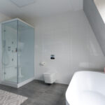 1e verdieping: overloop met glazen afscherming, tweede separaat modern toilet met een hangcloset, inbouwreservoir en een fonteintje. Ruime slaapkamer aan de voorzijde van de woning met prettig lichtinval door de hoekligging. Twee slaapkamers aan de achterzijde van de woning. Tussenliggende strakke badkamer welke is voorzien van een ligbad (whirpool), inloopdouche en een breed wasmeubel met een dubbele kraan.