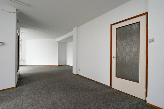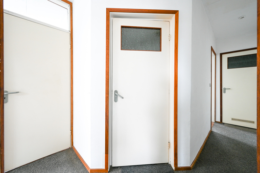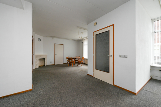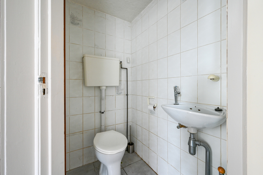 Entree op straatniveau naar de centrale hal met meterkast. De ruime woonkamer heeft dankzij de hoekligging veel lichtinval en een prettige sfeer. Vanuit de tussenhal is er toegang tot een separaat toilet met fonteintje en de volledig betegelde badkamer, voorzien van een douchecabine en een breed wasmeubel.