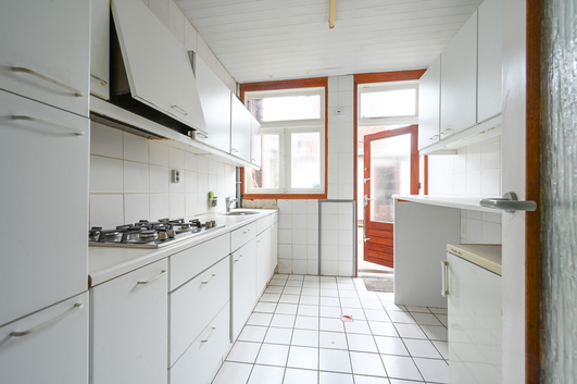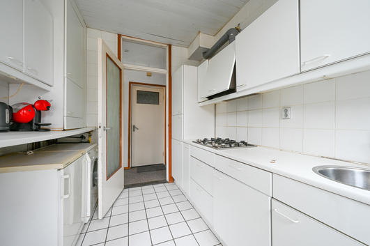 De keuken bevindt zich aan de achterzijde van de woning en is uitgevoerd in een rechte opstelling met veel kastruimte. De keuken beschikt over een 4-pits gaskookplaat, afzuigkap, en een tweede werkblad met extra bergruimte. Handig weggewerkt bevindt zich hier ook de opstelplaats voor de cv-ketel (Vaillant). Via de achterdeur is de achtertuin bereikbaar met een zij-ingang, met een praktische poort, ideaal voor bijvoorbeeld motorrijders. De berging is momenteel verbonden met de garage, die voorzien is van een lichtkoepel.