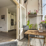 - De openslaande deuren in de woonkamer zijn voorzien van houten kozijnen met dubbel glas