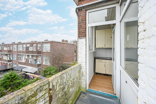 De keuken is aan de achterzijde van de woning gelegen en uitgevoerd in een rechte opstelling. Deze is uitgerust met een 4-pits gaskookplaat, afzuigkap en oven. De cv-ketel (Remeha, 2020) is keurig weggewerkt in een kast. Vanuit de keuken is er toegang tot het balkon.