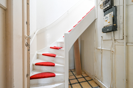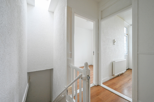 Via het open portiek bereikt u de entree van het appartement op de eerste verdieping. Vanuit de hal heeft u toegang tot de meterkast (3 groepen) en leidt de binnentrap naar de tweede verdieping.