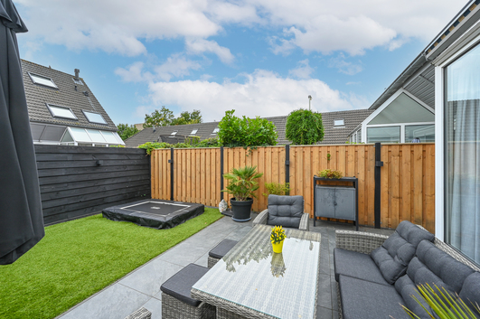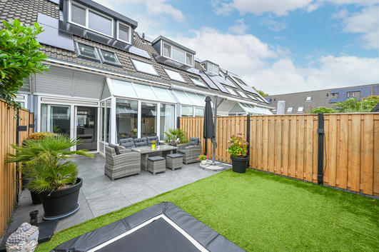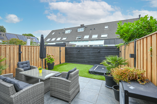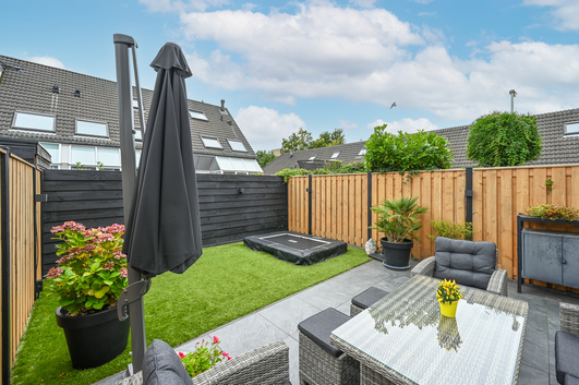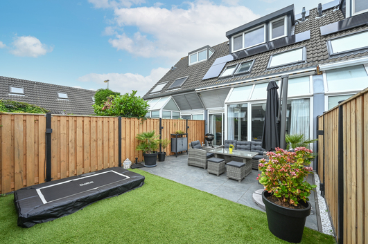 Via de schuifpui stap je zo de verzorgde achtertuin in: een fijne buitenruimte met terras, groenstrook, fraaie schuttingen en slimme tuinverlichting. Dankzij de ligging kun je hier volop genieten van de zon en privacy.