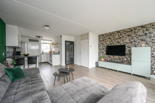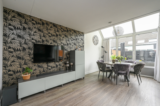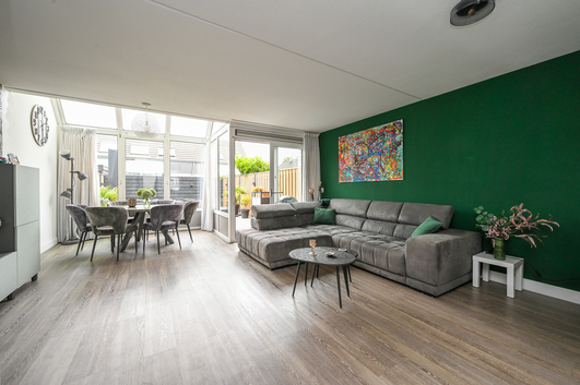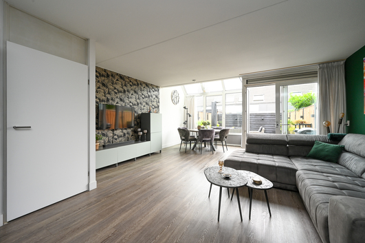 De living verrast met een rustige uitstraling en enorm veel lichtinval, mede dankzij de serre die een prachtige verbinding vormt met de achtertuin. Een vaste kast biedt extra bergruimte. De gehele begane grond is afgewerkt met een strakke pvc-vloer, voorzien van comfortabele vloerverwarming.