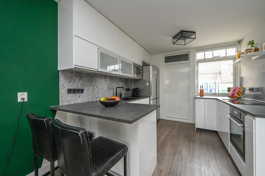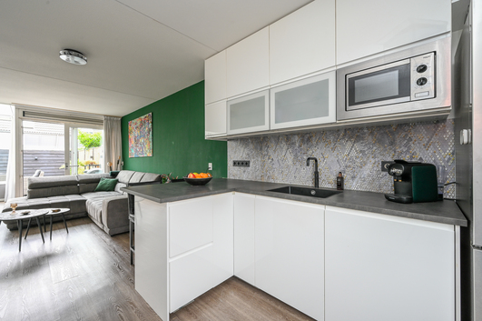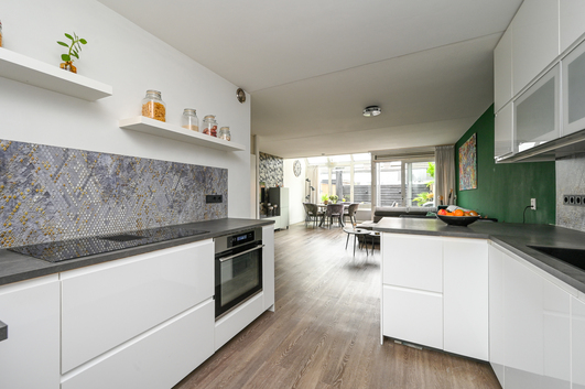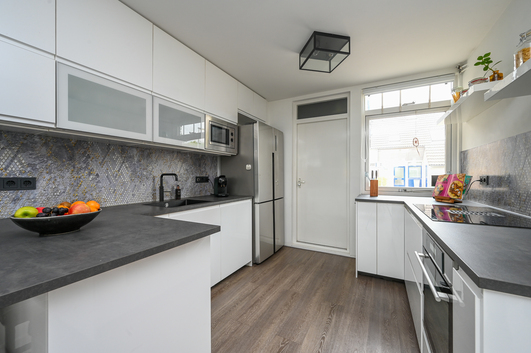 Aan de voorzijde van de woning bevindt zich de luxe keuken (2021), die in directe verbinding staat met de berging/bijkeuken. Deze luxe keuken is van alle gemakken voorzien: een inductiekookplaat met geïntegreerde afzuiging, een oven, magnetron, vaatwasser, Quooker, een royale Amerikaanse koel-/vriescombinatie en handig weggewerkte plaats voor de pomp van de vloerverwarming. Een droom voor iedereen die van koken houdt!