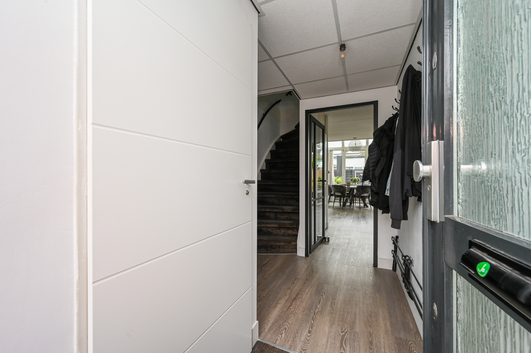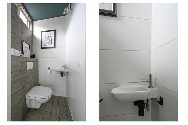 Bij binnenkomst word je verwelkomd in de hal met meterkast (12 groepen) en een modern, volledig betegeld toilet met hangcloset, inbouwreservoir en fonteintje.