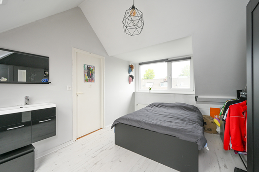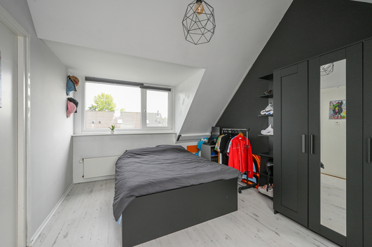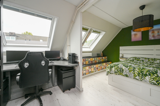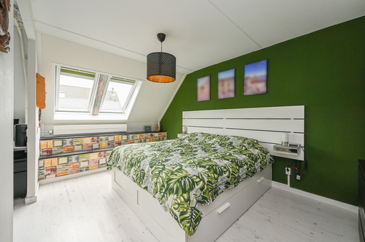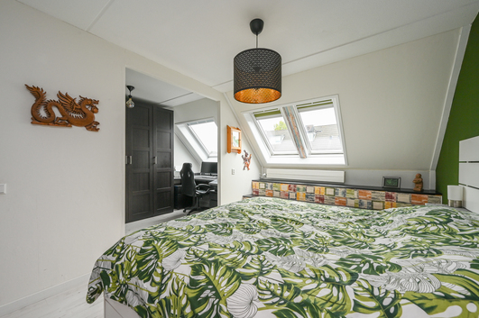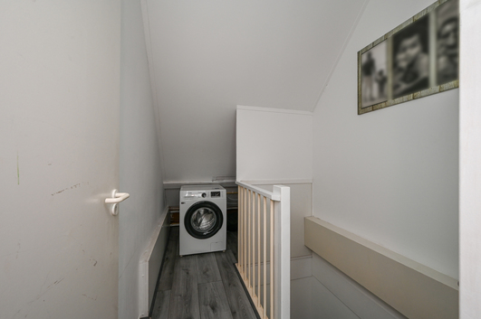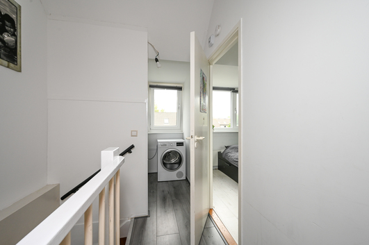 De overloop beschikt over aansluitingen voor een was-/droogcombinatie, de cv-ketel (Nefit, 2008), de unit voor mechanische ventilatie en de inverter voor de zonnepanelen. Verder is er een royale slaapkamer met aan de voorzijde een dakraam en aan de achterzijde een dakkapel, die zorgt voor extra ruimte en een fraai uitzicht over de achtertuin. Achter de knieschotten is bovendien volop bergruimte aanwezig.