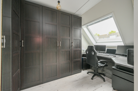 De overloop geeft toegang tot een royale masterbedroom aan de achterzijde, voorzien van een inloopkast die indien gewenst eenvoudig kan worden ingericht als vierde slaapkamer. Daarnaast is er ruimte voor een royale thuiswerkplek. Dankzij de drie dakramen met zonwering is ook hier het lichtinval ideaal.