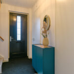 Voortuin, oprit met parkeerplaatsen, garage, schuur en toegang tot de woning middels de zijgevel. Ruime entree met meterkast (15 groepen), vaste kast met opstelplaats voor de individuele warmtepomp en boilervat (200 liter) en een modern toilet met een hangcloset, inbouwreservoir en een fonteintje.