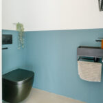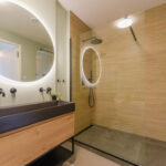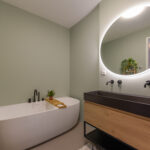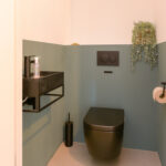1e verdieping: overloop met een modern toilet voorzien van een hangcloset, inbouwreservoir en een fonteintje. Masterbedroom is gesitueerd aan de achterzijde van de woning met zicht op de achtertuin. Fraaie luxe badkamer met een design ligbad, riante inloopdouche met regen- en handdouche en een breed wasmeubel met een dubbele kraan. Twee slaapkamers aan de voorzijde van de woning waarbij de grootste slaapkamer via openslaande deuren toegang geeft tot een balkon.