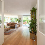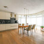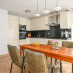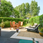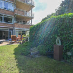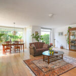Parel van het appartement is de combinatie van prettige living en royale woonkeuken. De lichte, tuingerichte living biedt volop ruimte en heeft openslaande deuren naar de weelderige achtertuin met twee zonneschermen voor fijne schaduwplekken. De royale woonkeuken met halfronde serre biedt volop lichtinval en ruimte voor gezellige avonden. De keuken in hoekopstelling is compleet uitgerust met veel inbouwapparatuur waaronder een inductiekookplaat, afzuigkap (recirculatie), vaatwasser, combi-oven, magnetron, Quooker en een koel-/vriescombinatie.
