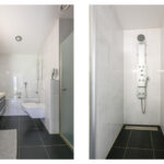 Aan de rustige zijde van de binnentuin bevinden zich drie slaapkamers, waaronder een royale masterbedroom met luxe volbetegelde ensuite badkamer voorzien van een ligbad, douchegelegenheid, breed wasmeubel met een dubbele kraan, handdoekenradiator en prive toilet met hangcloset en een inbouwreservoir.