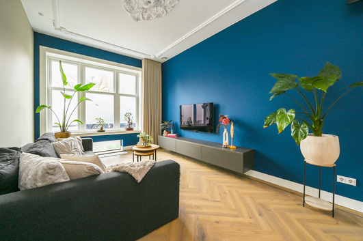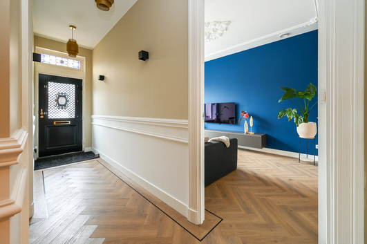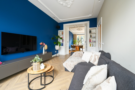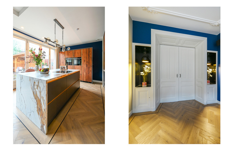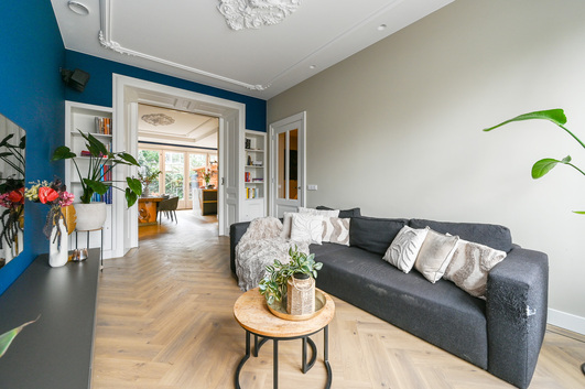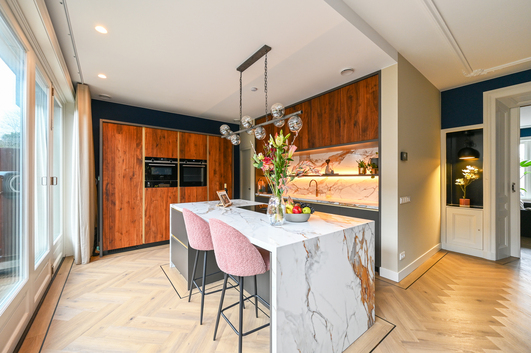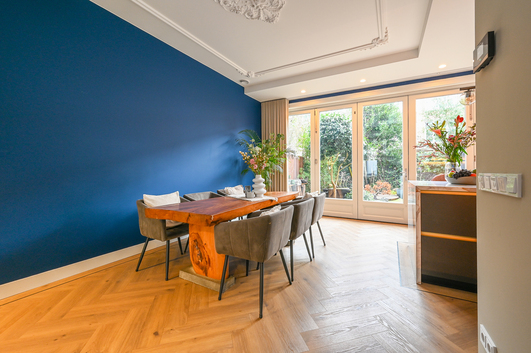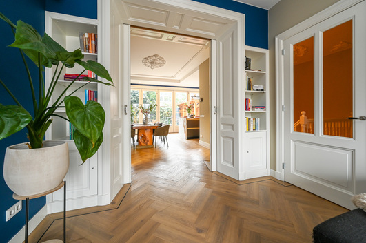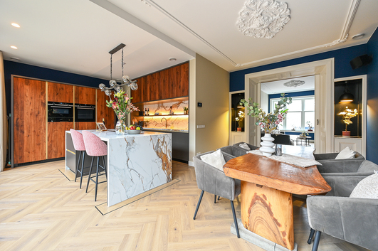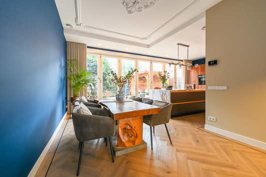 De uitbouw maakt de woning heerlijk licht. De imposante harmonica-schuifpui, het fraaie stucwerk met ornamenten en de pvc-visgraatvloer geven het geheel een luxe uitstraling. De elegante schuifseparatie met fraaie panelen zorgt daarbij voor een subtiele scheiding tussen wonen en koken.