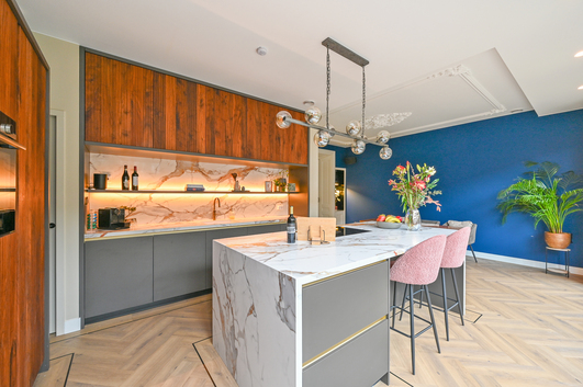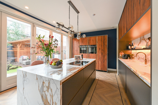 De tuingerichte woonkeuken met eetkamer vormt het hart van het huis en is een absolute eyecatcher. Het kookeiland met ontbijtbar nodigt uit tot uitgebreid koken en gezellig samenzijn met familie en vrienden.