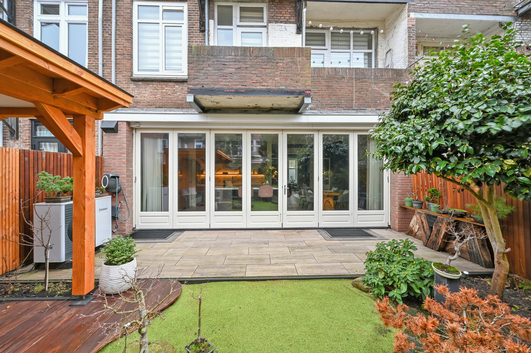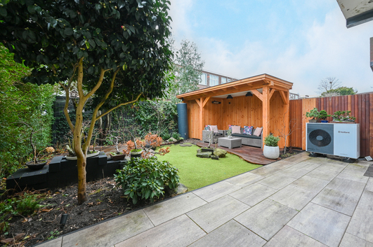 Via de imposante harmonica-schuifpui met loopdeur vormt de tuin werkelijk een verlengstuk van de woning. Onder de houten overkapping is het heerlijk genieten; daarnaast is er een berging. Ook de buitenunit (Vaillant, 2023) is hier opgesteld.