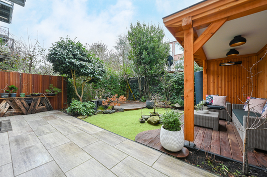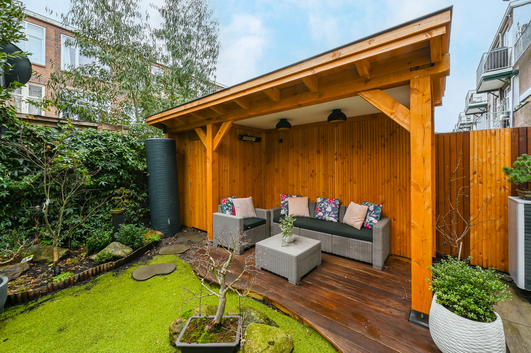 Via de fraaie achterpui stap je zo de prachtig aangelegde achtertuin in met houten overkapping en berging. Een heerlijke plek om lange zomerse avonden door te brengen.