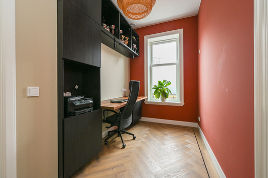 Aan de voorzijde ligt een slaapkamer die momenteel in gebruik is als werkkamer. Deze kamer beschikt over een vaste kast met daarin de meterkast (16 groepen). Ook aan de voorzijde bevindt zich de knusse living, voorzien van een spectaculair strak plafond met ornamenten en inbouwspots.