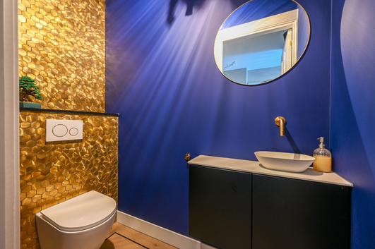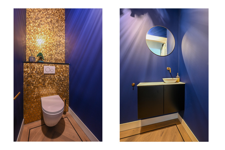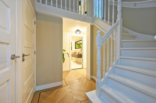 Bij binnenkomst in de hal ervaar je direct een echt wow-moment dankzij de hoogwaardige wand- en vloerafwerking en het imposante trappenhuis. In de hal bevindt zich tevens het moderne toilet, uitgevoerd met een hangcloset, inbouwreservoir en een wasmeubel met compacte waskom.