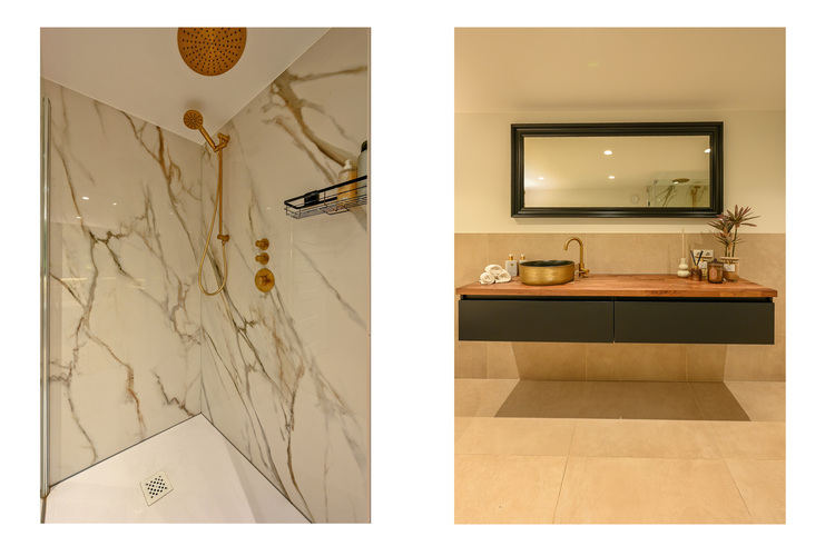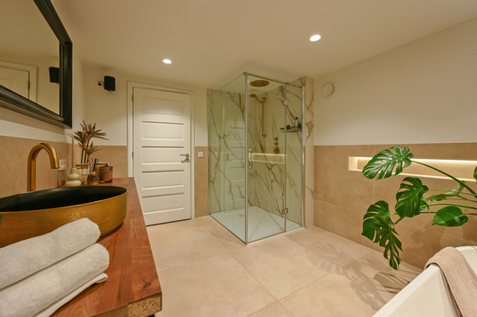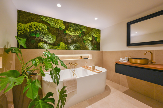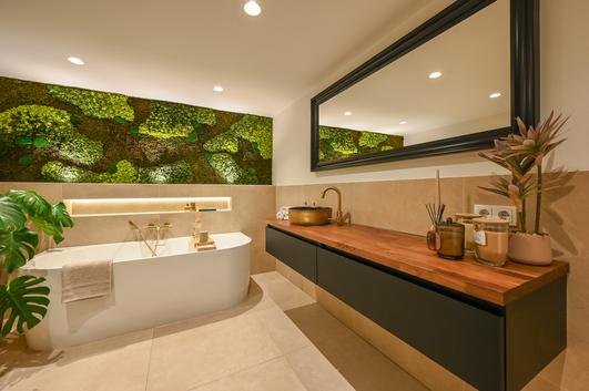 De badkamer straalt pure luxe uit en is uitgevoerd met een unieke moswand, een royaal ligbad, een riante inloopdouche, een breed wasmeubel en elegante inbouwkranen.