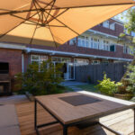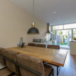 Door de brede stoep een fijne entree tot het appartement, hal met een modern toilet welke is voorzien van een hangcloset, inbouwreservoir en een wasmeubel met fonteintje. Woonkamer ensuite met een erker waardoor leuk uitzicht, gezellige haard en de bekende kastruimte en schuifdeuren. Aan de achterzijde van het appartement een eetkamer met aangrenzend een luxe open keuken met een rechte opstelling welke is voorzien van een prachtige 5-pits gasfornuis met een grote oven van Bertazzoni, afzuigkap, vaatwasser en veel kastruimte. Twee rechte opstelling met opstelplaats voor een was-/droogcombinatie en handig werkblad en een losstaande Amerikaanse koel-/vriescombinatie. Vanuit de keuken toegang tot de achtertuin middels openslaande deuren. De achtertuin met stenen berging heeft een goede zonligging van middag tot avond waardoor veel zonuren. Onderhoudsvriendelijk terras achterin de tuin met voldoende ruimte voor een loungeset.