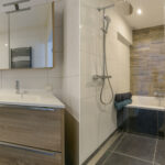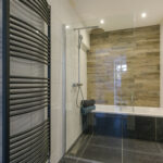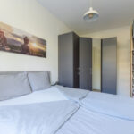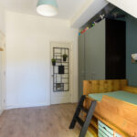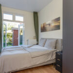 Aan de voorzijde van het appartement een slaapkamer me vaste kast waarin een meterkast (9 groepen). Verder een luxe en moderne badkamer met een ligbad, inloopdouche, wasmeubel en een handdoekenradiator. Twee slaapkamers aan de achterzijde van het appartement waaronder de voormalige keuken met opstelplaats voor een cv-ketel (Remeha 2017). De masterbedroom geeft ook toegang tot de tuin via openslaande deuren .