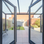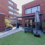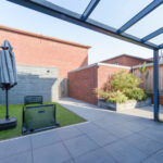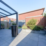 Vanuit de living via openslaande deuren toegang tot de achtertuin welke is voorzien van sierbestrating, aluminium overkapping, houten berging en een achterom.