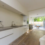 Bij binnenkomst via de trendy schuifdeur naar de woonkamer valt direct de centraal gelegen keuken op, die perfect in verbinding staat met de eetkamer aan de voorzijde van de woning. De strakke, moderne keuken is voorzien van hoogwaardige inbouwapparatuur, waaronder een inductiekookplaat, afzuigkap, vaatwasser, magnetron en een koel-/vriescombinatie.