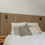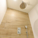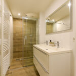 1e verdieping: De woning beschikt over een royale slaapkamer aan de voorzijde, ideaal voor een rustige en comfortabele nachtrust. De volledig betegelde badkamer is stijlvol en modern afgewerkt, met een inloopdouche voorzien van fraai ingebouwde kranen, een regen- en handdouche, een breed wasmeubel met dubbele wastafel en een toilet met hangcloset en inbouwreservoir.