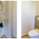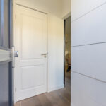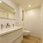 De hal biedt toegang tot de meterkast (9 groepen) en een modern afgewerkt toilet met hangcloset, inbouwreservoir en een stijlvol fonteintje.