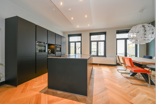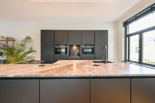 De keuken is het middelpunt van het appartement met een riant kookeiland met een BORA inductiekookplaat met geïntegreerde afzuiging, spoelbak en vaatwasser. Een strakke kastenwand met een handige nis voor een koffiecorner, 2x combi-oven en een koel-/vriescombinatie.