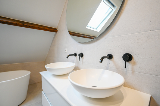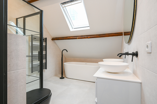 Schitterende luxe badkamer met een vrijstaand badkamer, wasmeubel met een dubbele waskom, douchecabine, handdoekenradiator, fraai ingebouwde kranen en een toilet met hangcloset en een inbouwreservoir.