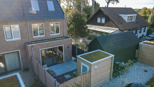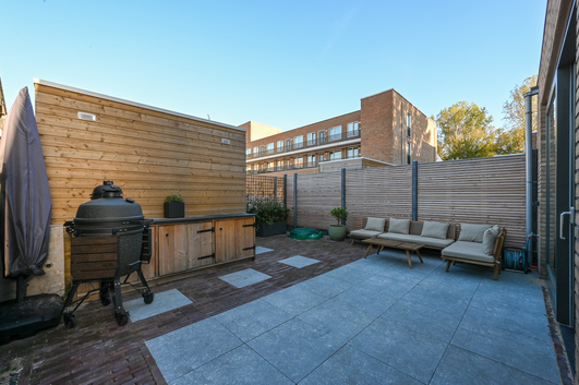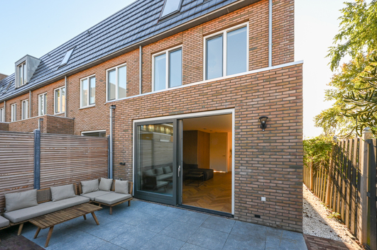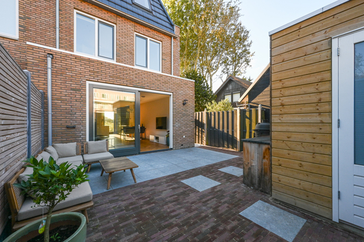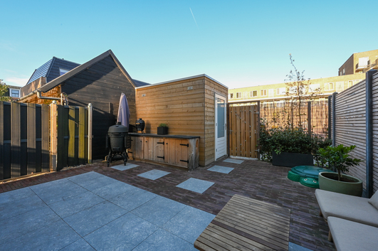Aan de achterzijde zorgt een grote schuifpui voor een prachtig zicht op de tuin en een overvloed aan daglicht, ook in de winter is het hier heerlijk licht. De fraai aangelegde achtertuin biedt volop zon, rust en privacy en is voorzien van een ruim terras, een groenstrook, een praktische berging en een handige achterom naar het gemeenschappelijke parkeerterrein met een eigen parkeerplaats direct achter de woning.
