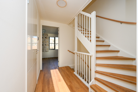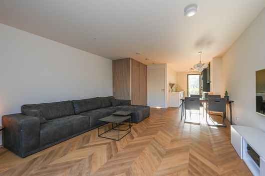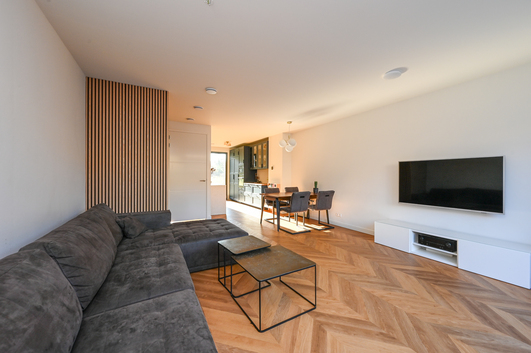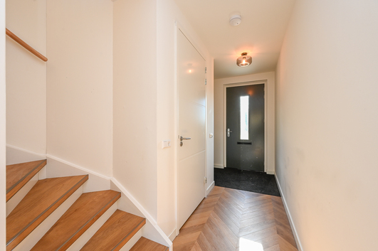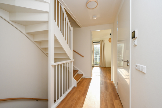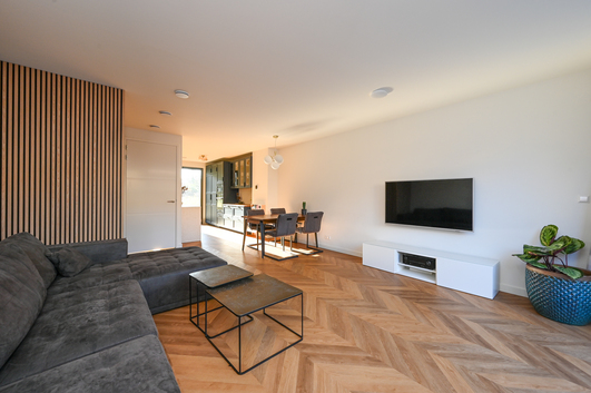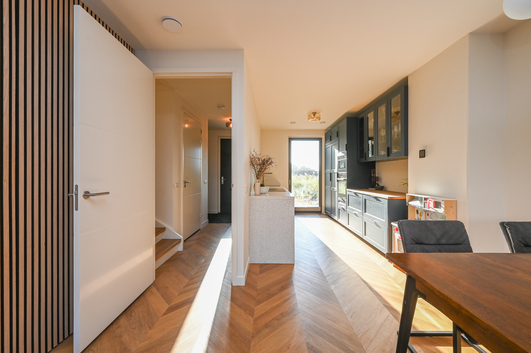 De royale living ademt stijl en comfort, met een strak gestuct plafond en een warme pvc-vloer die de ruimte een luxe uitstraling geeft. In de praktische trapkast met fraaie wandpanelen is extra bergruimte en een garderobe gecreëerd.