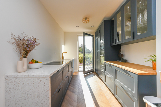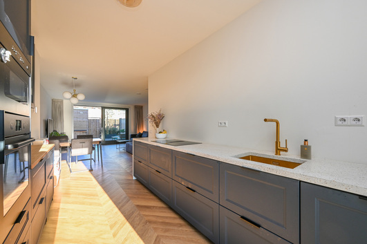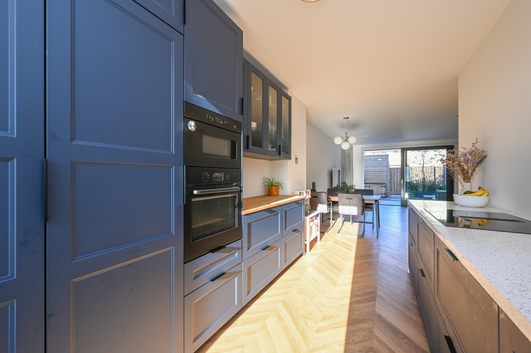 Aan de voorzijde ligt de verzorgde keuken in dubbele rechte opstelling, met veel werk- en kastruimte. De keuken is uitgerust met hoogwaardige inbouwapparatuur, waaronder een AEG-inductiekookplaat met geïntegreerde afzuiging, vaatwasser, oven, magnetron, grote koelkast en vriezer. Dankzij een extra deur naar de voortuin geniet u hier van extra lichtinval, ideaal voor een ochtendkoffie in de zon.