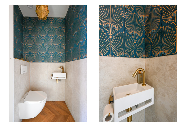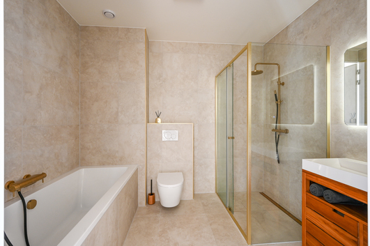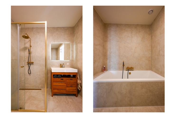 De moderne, volledig betegelde badkamer is uitgerust met alle gemakken en straalt een luxe hotelgevoel uit. U vindt hier een royaal ligbad, een inloopdouche met regen- en handdouche, een stijlvol wastafelmeubel en een modern tweede toilet met hangcloset en inbouwreservoir.