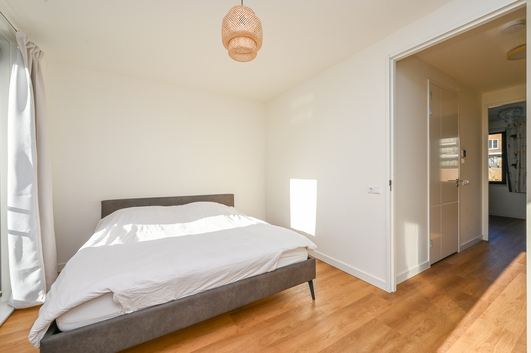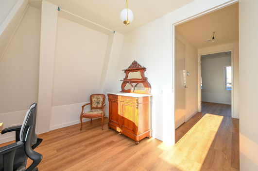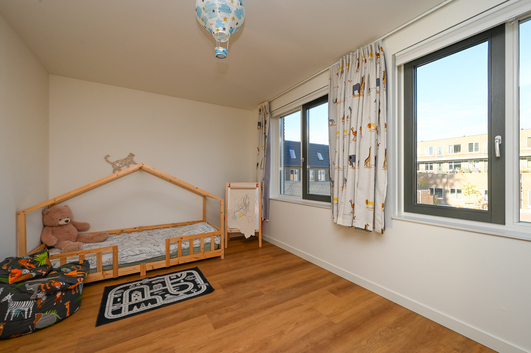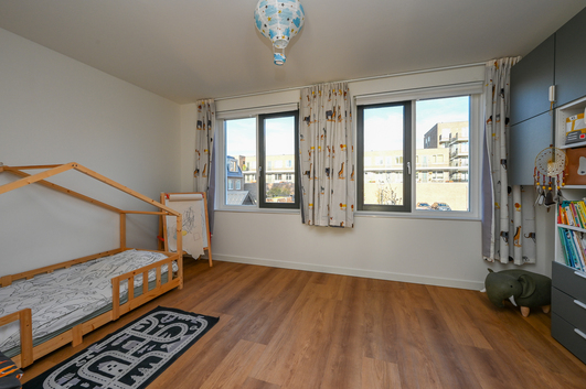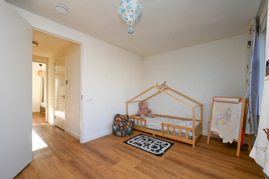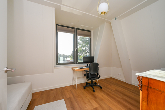 Aan de achterzijde bevindt zich een tweede ruime slaapkamer, met een prettig uitzicht over de achtertuin. Deze kamer is ideaal als kinderkamer, werkkamer of logeerruimte.