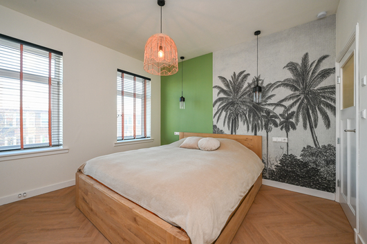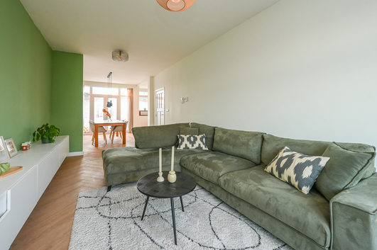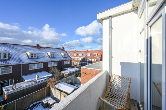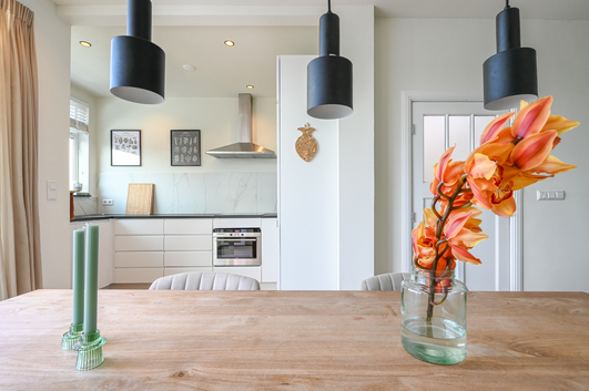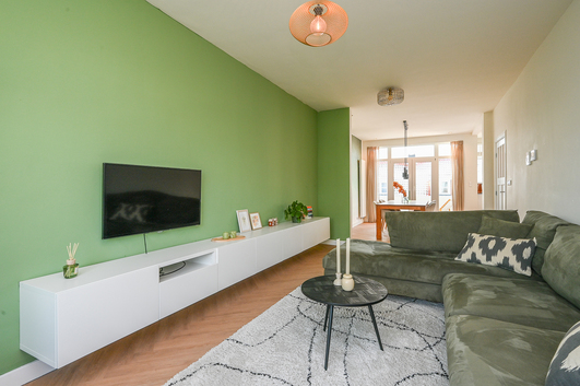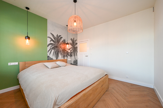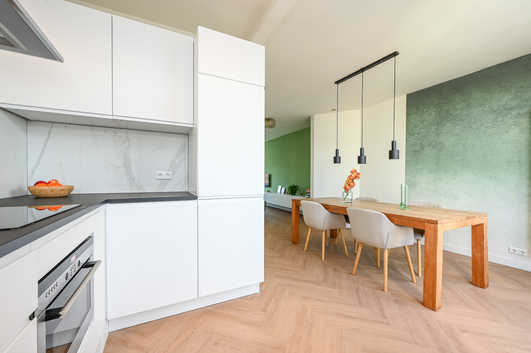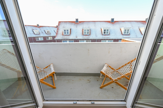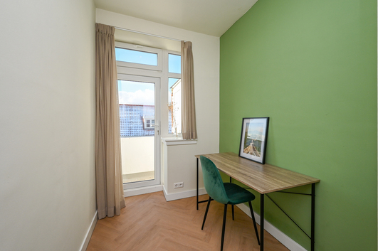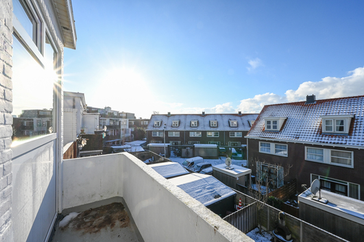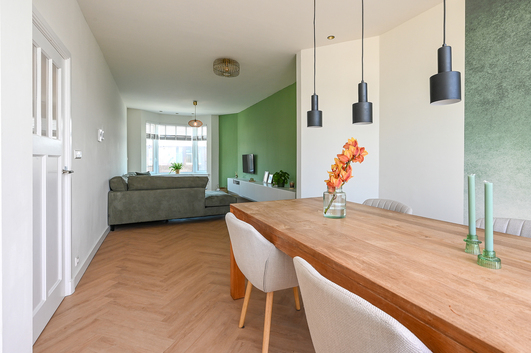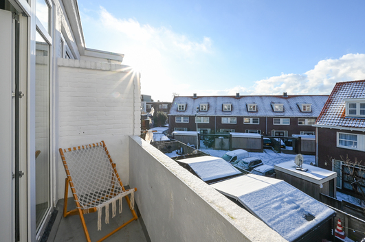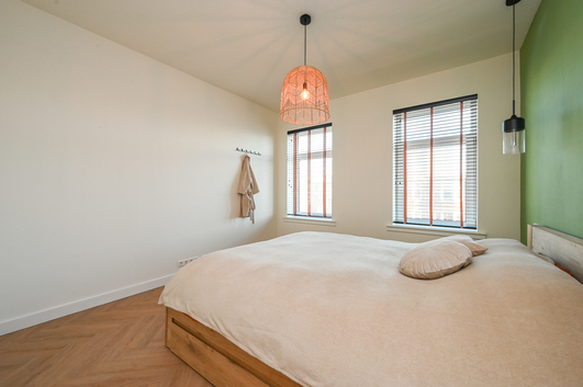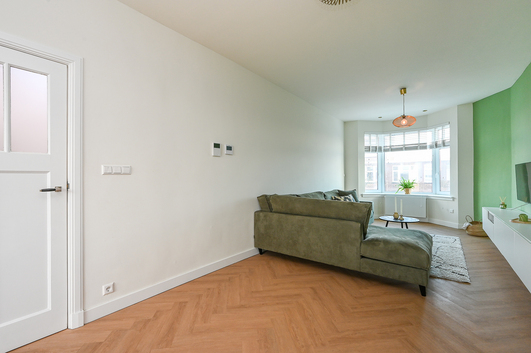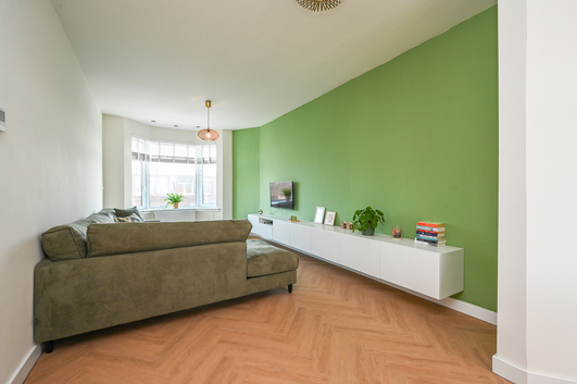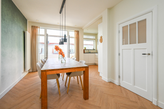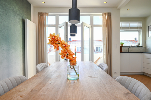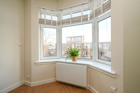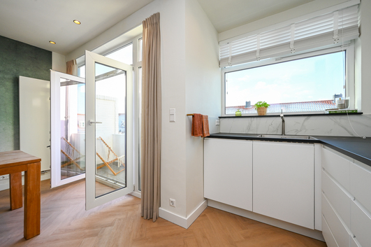 De living is verrassend licht en sfeervol, met aan de voorzijde een erker en een leuk uitzicht over de straat. Aan de achterzijde bevindt zich een gezellige eethoek met een halfopen, moderne keuken. De keuken in hoekopstelling is voorzien van een inductiekookplaat, afzuigkap, vaatwasser, oven en een koel-/vriescombinatie. Via openslaande deuren bereikt u het balkon.
