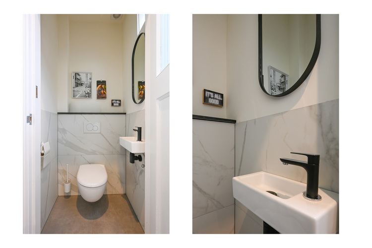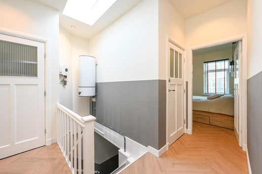 Tweede verdieping: brede en lichte overloop dankzij de lichtkoepel, met een fraaie PVC-vloer in visgraat. In het trapgat is de boiler slim geplaatst, inclusief inverter voor de zonnepanelen. Separaat modern toilet met hangcloset, inbouwreservoir en fonteintje.