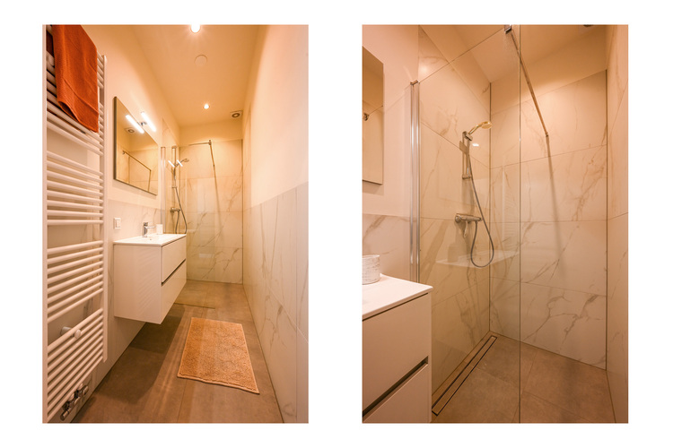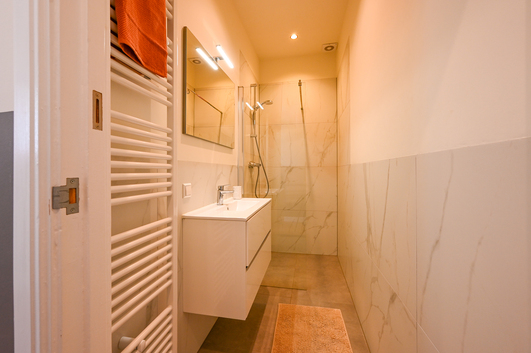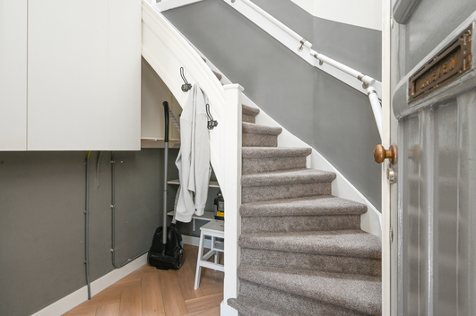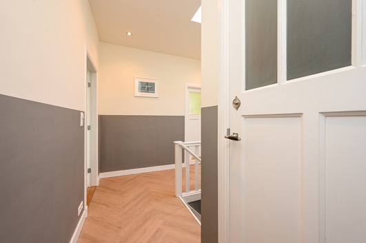 Via een open portiek bereikt u de entree van het appartement op de eerste verdieping. In de hal bevinden zich de meterkast (11 groepen), een praktische berging en de binnentrap naar de tweede verdieping.