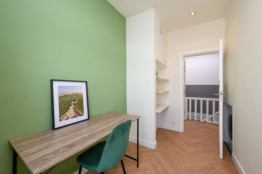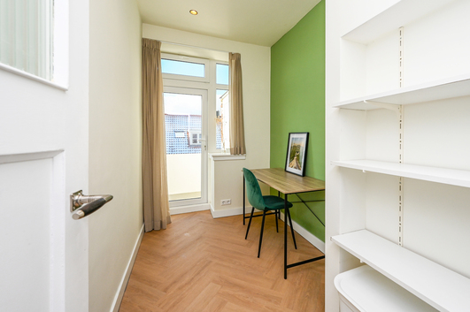 De tweede slaapkamer bevindt zich aan de achterzijde en geeft toegang tot het tweede balkon. In de balkonkast is de warmtepomp opgesteld.