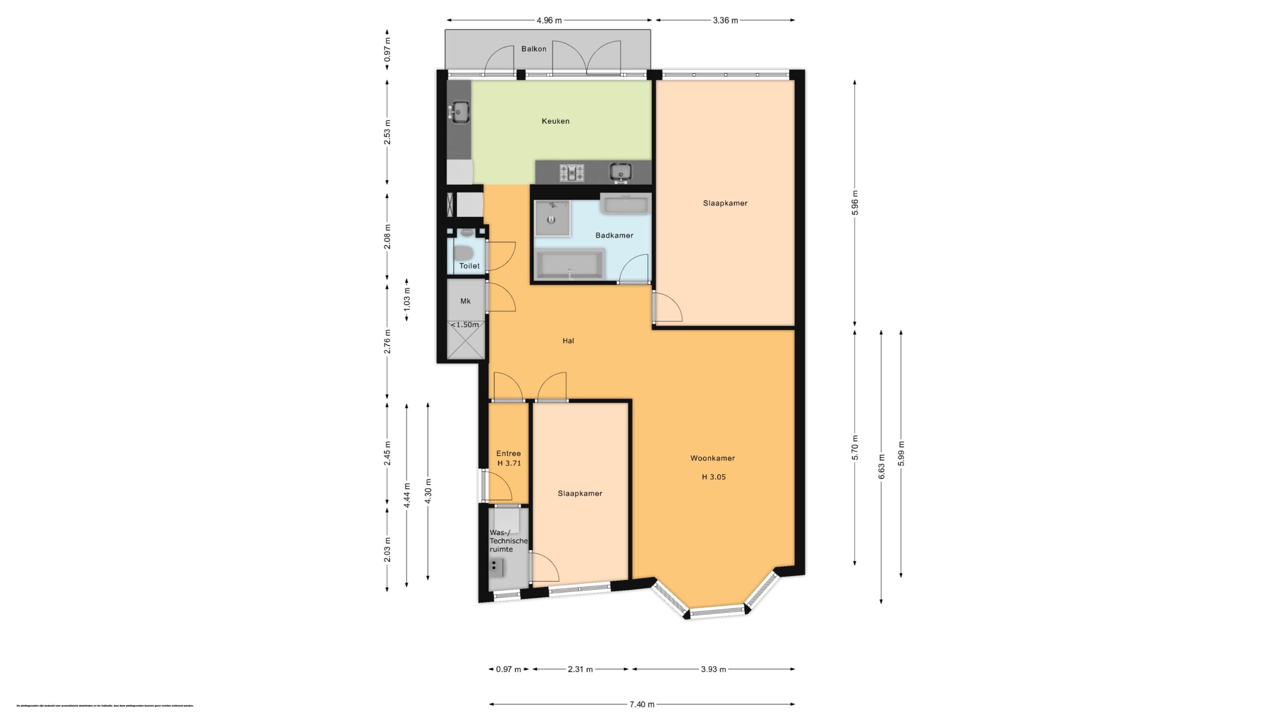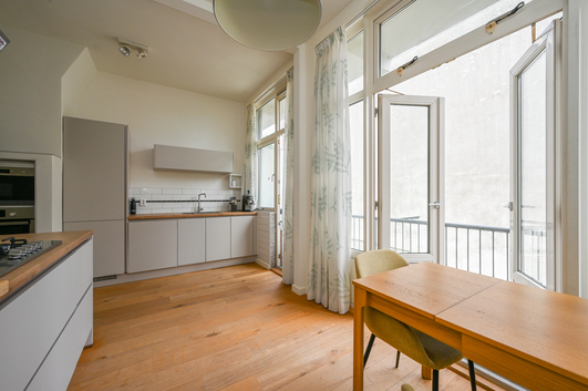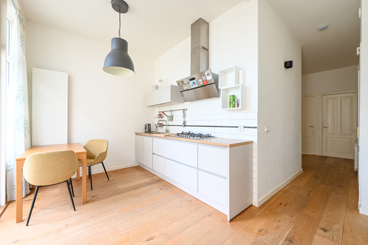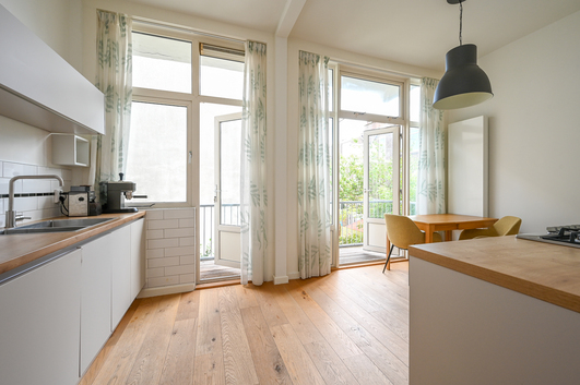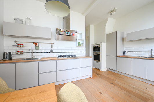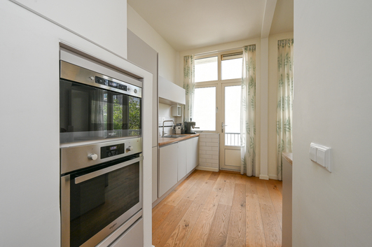 Aan de achterzijde van de woning bevindt zich de riante woonkeuken, ontstaan door het samenvoegen van een voormalige slaapkamer. Deze keuken is uitgevoerd in twee rechte opstellingen met veel kastruimte en werkblad. Uiteraard is er volop inbouwapparatuur aanwezig: een 5-pits gaskookplaat, afzuigkap (recirculatie), oven, magnetron, vaatwasser en koel-/vriescombinatie. Vanuit de keuken is er toegang tot het balkon.