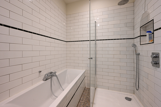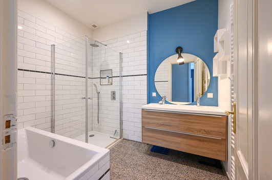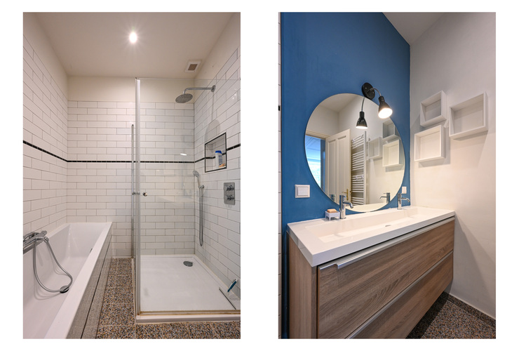De badkamer is compleet en verzorgd, voorzien van een ligbad, inloopdouche met regen- en handdouche, inbouwkranen, een breed wasmeubel met dubbele kraan en een handdoekenradiator.