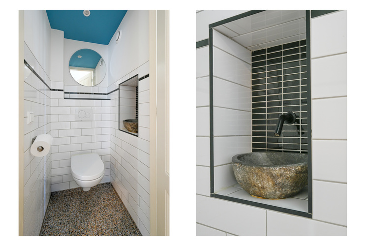 Via een open portiek bereikt u de entree van het appartement. De hal met lichte verhoging (4 treden) leidt naar een centrale, ruime ontvangsthal met vaste kast inclusief meterkast (8 groepen) en een modern toilet met handige nis, smaakvolle waskom met inbouwkraan, hangcloset en inbouwreservoir.