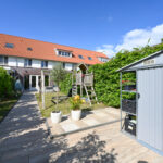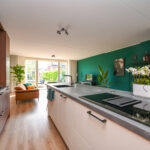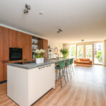 Middelpunt van de woning is de trendy keuken, die is uitgevoerd met een royaal kookeiland en een praktische kastenwand. De keuken beschikt over hoogwaardige inbouwapparatuur zoals een inductiekookplaat met geïntegreerde afzuiging, een dubbele koel-/vriescombinatie en een vaatwasser. Extra handig is de speciaal ontworpen nis voor een koffieapparaat en opbergruimte voor kookboeken.