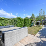 Aan de achterzijde bevindt zich een comfortabele loungehoek met openslaande deuren naar de riante achtertuin. Deze tuin is een oase van rust en biedt een prachtig uitzicht op de aangrenzende waterpartij met vlonder. De ligging aan het water en de goede bezonning maken dit een ideale plek om te ontspannen, te borrelen of te tuinieren.
